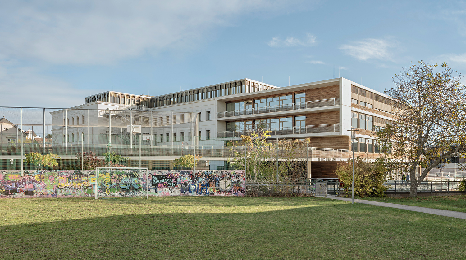 Das gesamte Schulgebäude wird mittels einer Tag- und Nachtkühlung über CO2 und Temperaturfühler automatisch gekühlt bzw. gelüftet. Über die Zug- und Druckpfähle der Turnhalle, welche als Energiepfähle ausgeführt wurden, wird das Schulgebäude in mehreren Bereichen gekühlt und beheizt. Eine Photovoltaik-Anlage auf dem Dach des Neubaus sorgt mit 110 kWp für Strom.