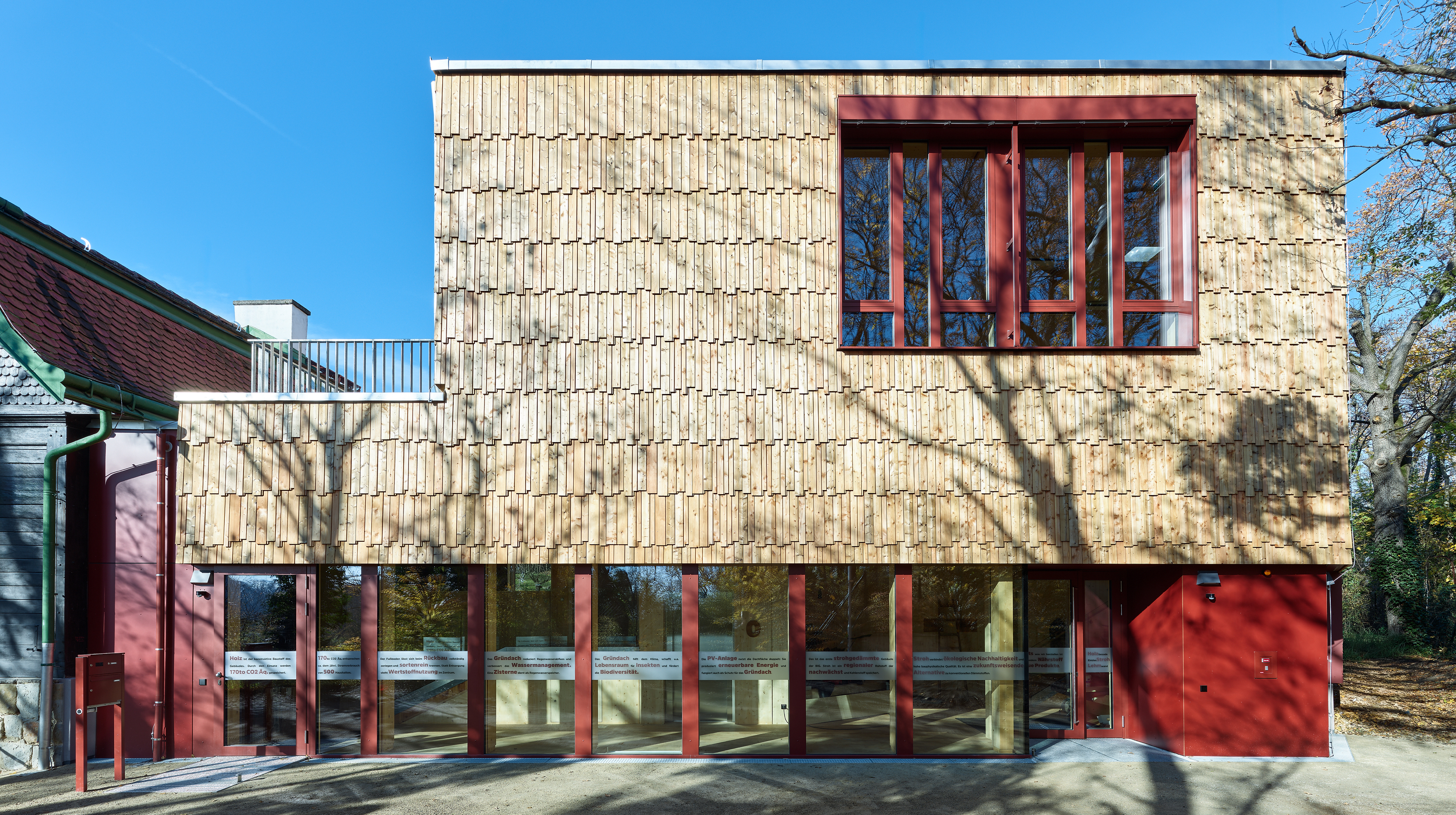 Der oberirdische Neubau wurde in Holz-Hybridbauweise aus regionalem Fichtenholz auf den vorhandenen Stahlbetonkeller aufgesetzt. Die Grundstruktur besteht aus Brettsperrholzscheiben, Skelettstützen und Unterzügen sowie aus einer aus Holzrahmenelementen bestehenden Hülle mit Massivholzdach. Beim Bau fanden fast ausschließlich biobasierte und regenerative Naturmaterialien Verwendung: Zur Dämmung wurden Stroh (Stroheinblasdämmung und Strohbauplatten) sowie Schafwolle genutzt, Hanfauflagen für Strohbau-Akustikplatten sorgen für ein angenehmes Raumgefühl. Auch in den Innenräumen fand Holz großflächige Anwendung, die durch Lehmspachtelungen mit feuchtigkeitsregulierenden Eigenschaften ergänzt werden. Bei der Innenausstattung orientierte man sich an Re-use Konzepten und nutzte ausschließlich Fliesenrestposten oder nutze alte Spiegel. Die Fassade wurde mit Holzschindeln aus hartem "Abschnittsholz" verkleidet.