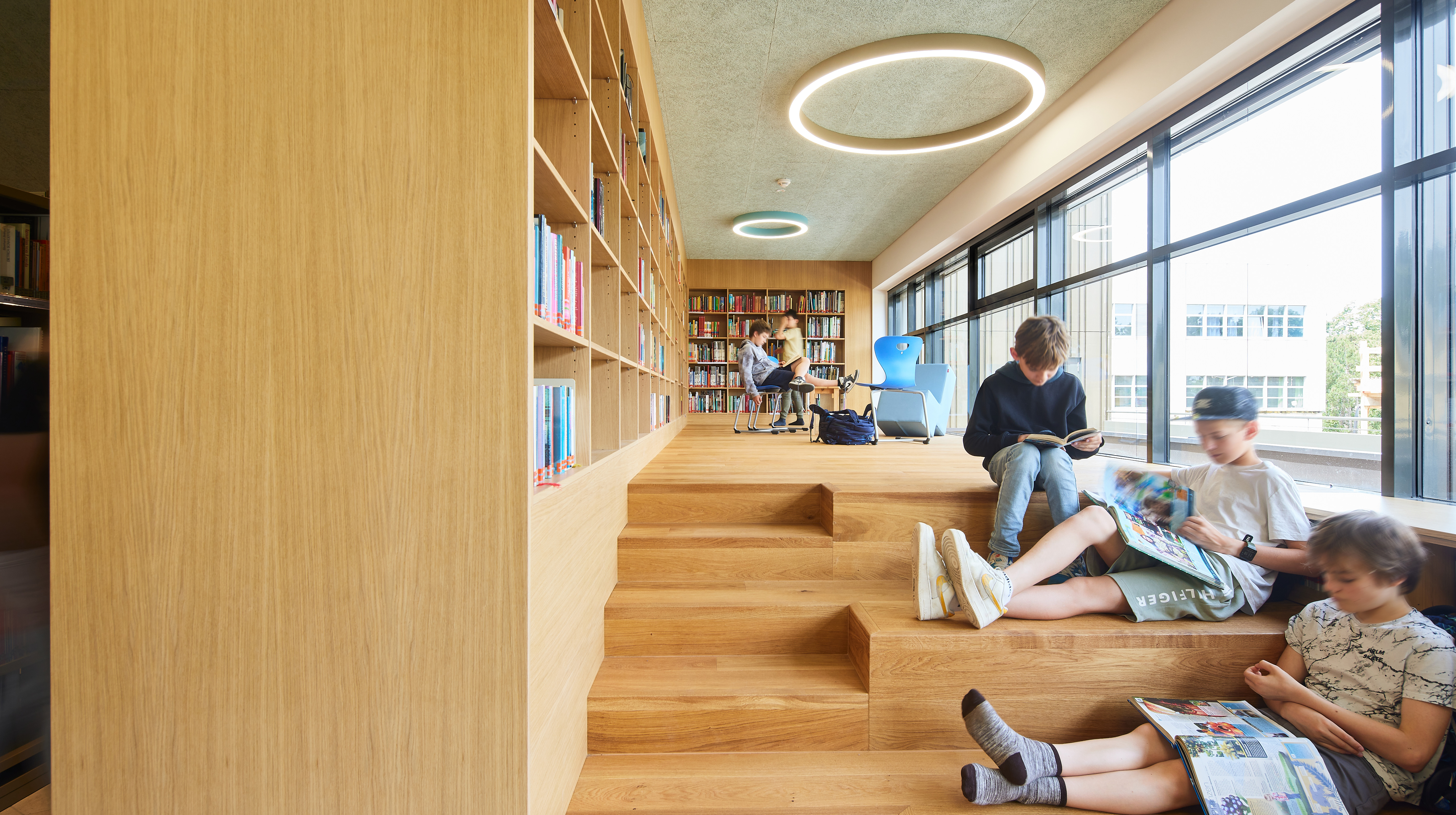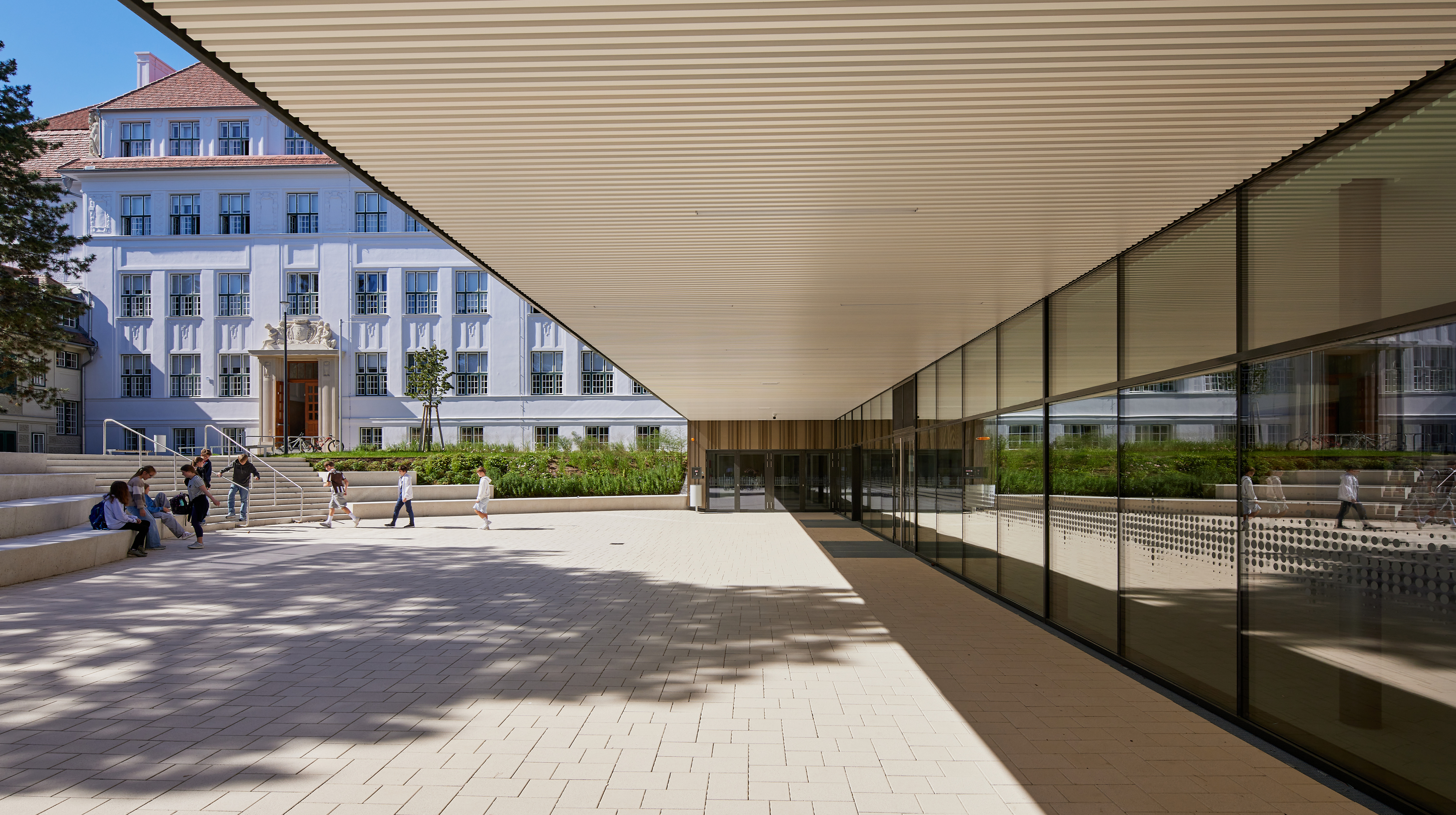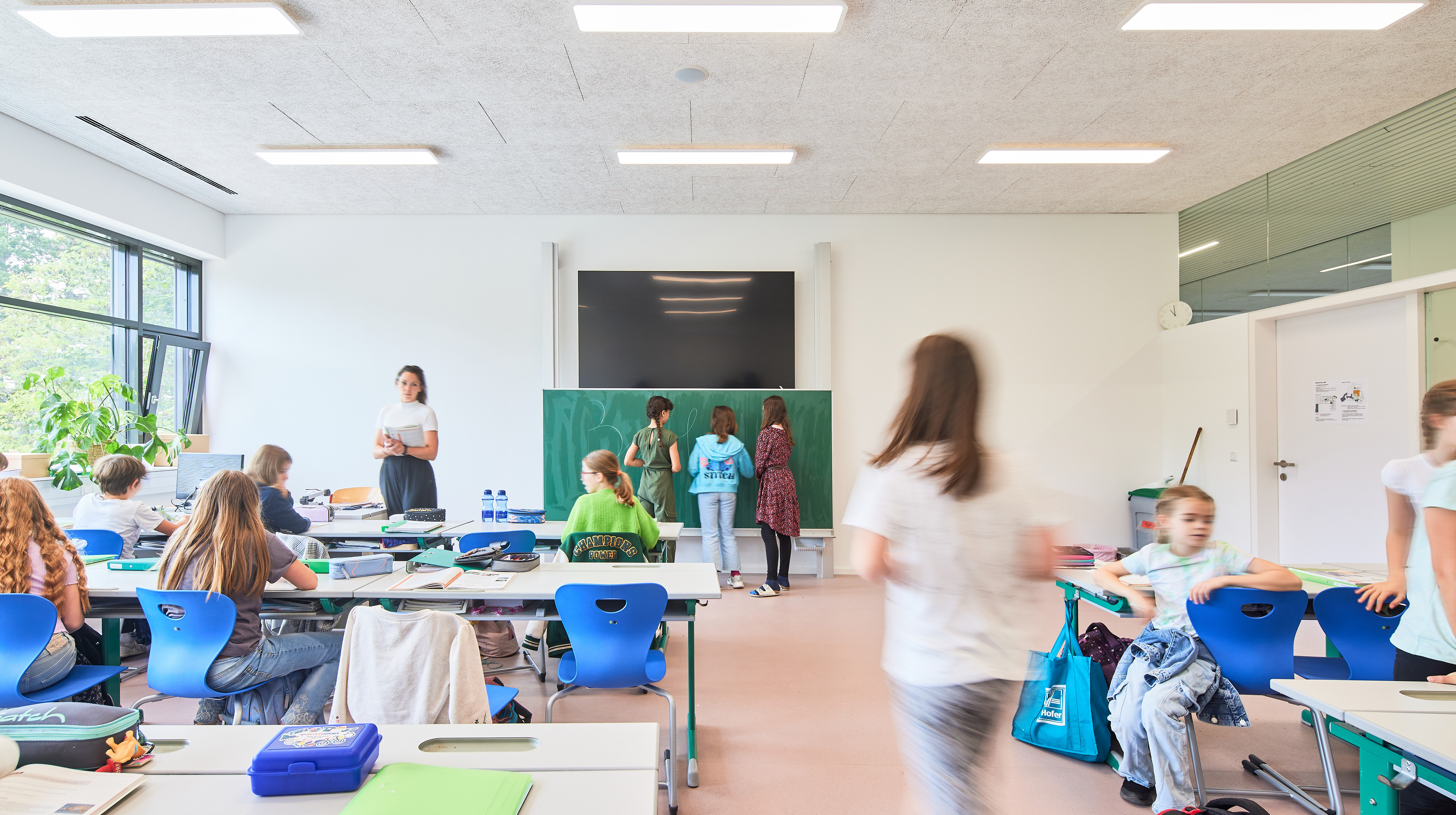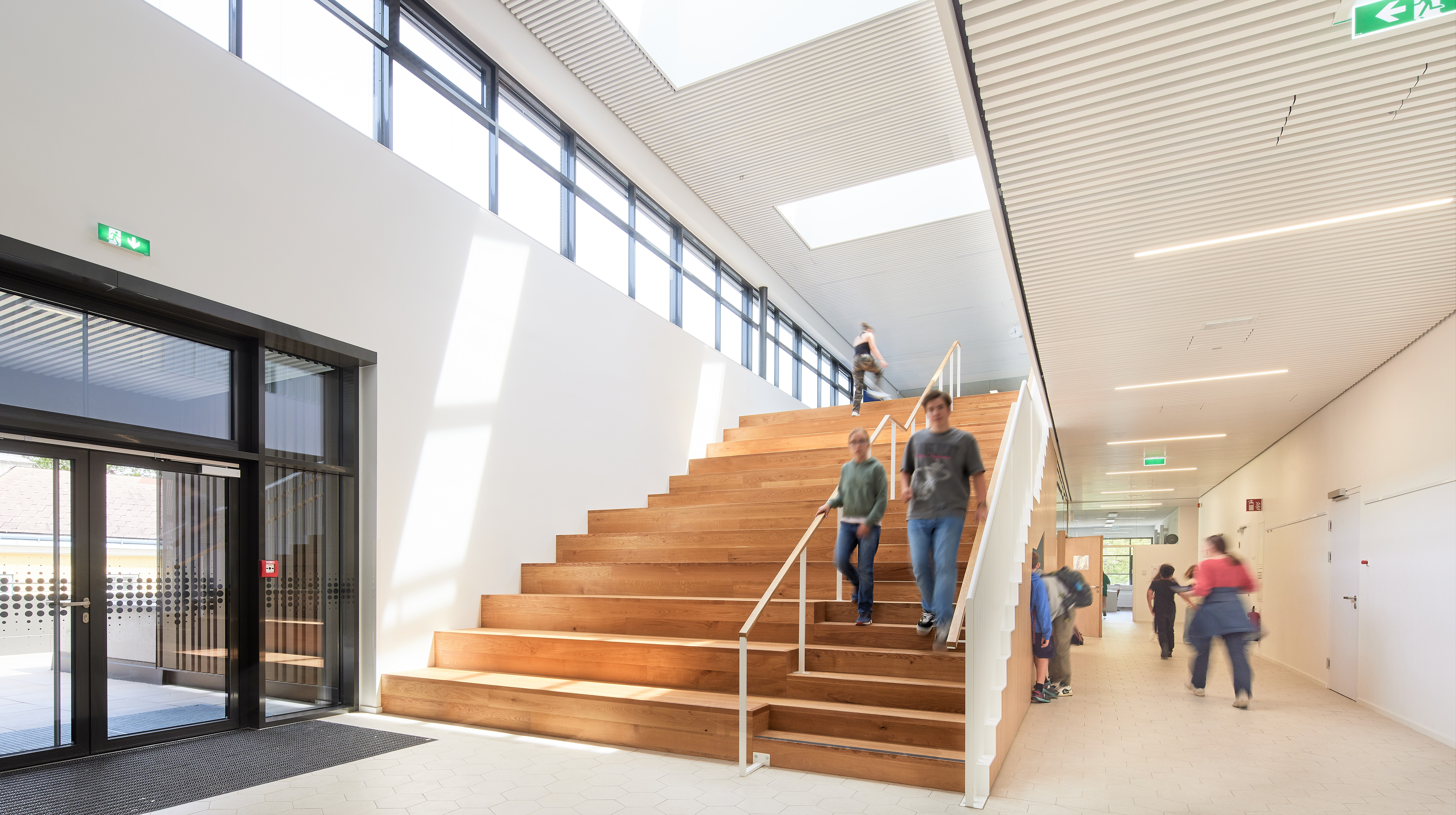 Großzügig gestaltete Pausenflächen und Rückzugorte für die Schülerinnen und Schüler ersetzen zukünftig die klassische Gangschule. Insgesamt stehen den Schülerinnen und Schülern nach Fertigstellung rund 8.600 m² Nettoraumfläche mit 37 Stammklassenräumen zur Verfügung. Im September 2025 kann in einer offenen und modernen Schule mit entsprechender Nachmittagsbetreuung wieder gelernt und gelehrt werden.