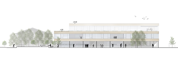 Das Projekt nimmt den Bestand voll inhaltlich in die Neukonzeption hinein und schafft somit “eine neue Schule”. Drei unterschiedlich hohe, flachgedeckte Baukörper gruppieren sich geordnet, aber spielerisch zu einem neuem städtebaulichen Ensemble: somit entsteht eine neue zukunftsorientierte Schule. Dieser Ansatz wird von der Jury gewürdigt und explizit hervorgehoben. Geschickt gesetzte Perforierungen bringen eine gute Dreidimensionalität bis in den Bestand hinein; damit erfährt der Gesamtbaukörper eine gesamtheitliche Neukonzeption und die Grundrisse sind in allen Bereichen auf hohem Niveau. Diese Funktionsqualität sticht im Vergleich zu vielen anderen Wettbewerbsbeiträgen klar heraus. Offenes lernen, Erschließung, Lufträume und großzügige Freiräume schaffen ein spannendes Raumgefüge und überzeugen damit die Jury räumlich und architektonisch. Durch die Verlegung und Anpassung des neuen Haupteinganges entsteht eine sehr schöne, neue Eingangssituation mit einem entsprechenden Vorfeld. Funktional sind insbesondere die Lerncluster sehr gut gelöst und stehen in schöner Kombination mit den offenen Lernzonen. Das Projekt nimmt Innen und Außen alle bestehenden und neuen Bauteile gleichwertig mit und bildet ein neues zukunftsorientiertes Schulgebäude. Ein überzeugender Wettbewerbsbeitrag.