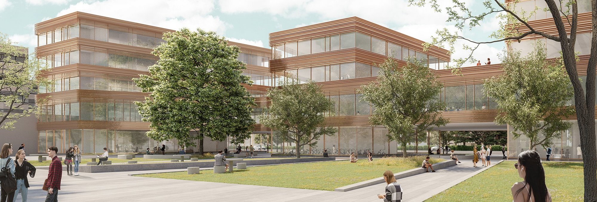 Der Neubau wird auf einem ehemaligen Parkplatz errichtet, was neue Bodenversiegelung vermeidet. Er besteht aus drei Bauteilen mit insgesamt 5.000 m² Nettoraumfläche, die über ein gemeinsames Stockwerk im ersten Obergeschoß verbunden sind. Auf den dazwischenliegenden Dächern befinden sich begehbare begrünte Terrassen. Planerisches Geschick war für die höchst schützenswerte Silberlinde am Bauplatz gesucht. Der fast hundert Jahre alte Laubbaum kann erhalten werden, das Gebäude wird quasi um ihn herumgebaut, von einigen Aufenthaltsräumen und einer Terrasse haben die Forscherinnen und Forscher einen schönen Blick auf die ausladende Baumkrone und können sich das Grün von draußen ins Gebäude holen. Außerdem werden ca. 15 neue Laubbäume gepflanzt und ein sechs Meter breiter Grünstreifen zum Gehsteig wird angelegt.