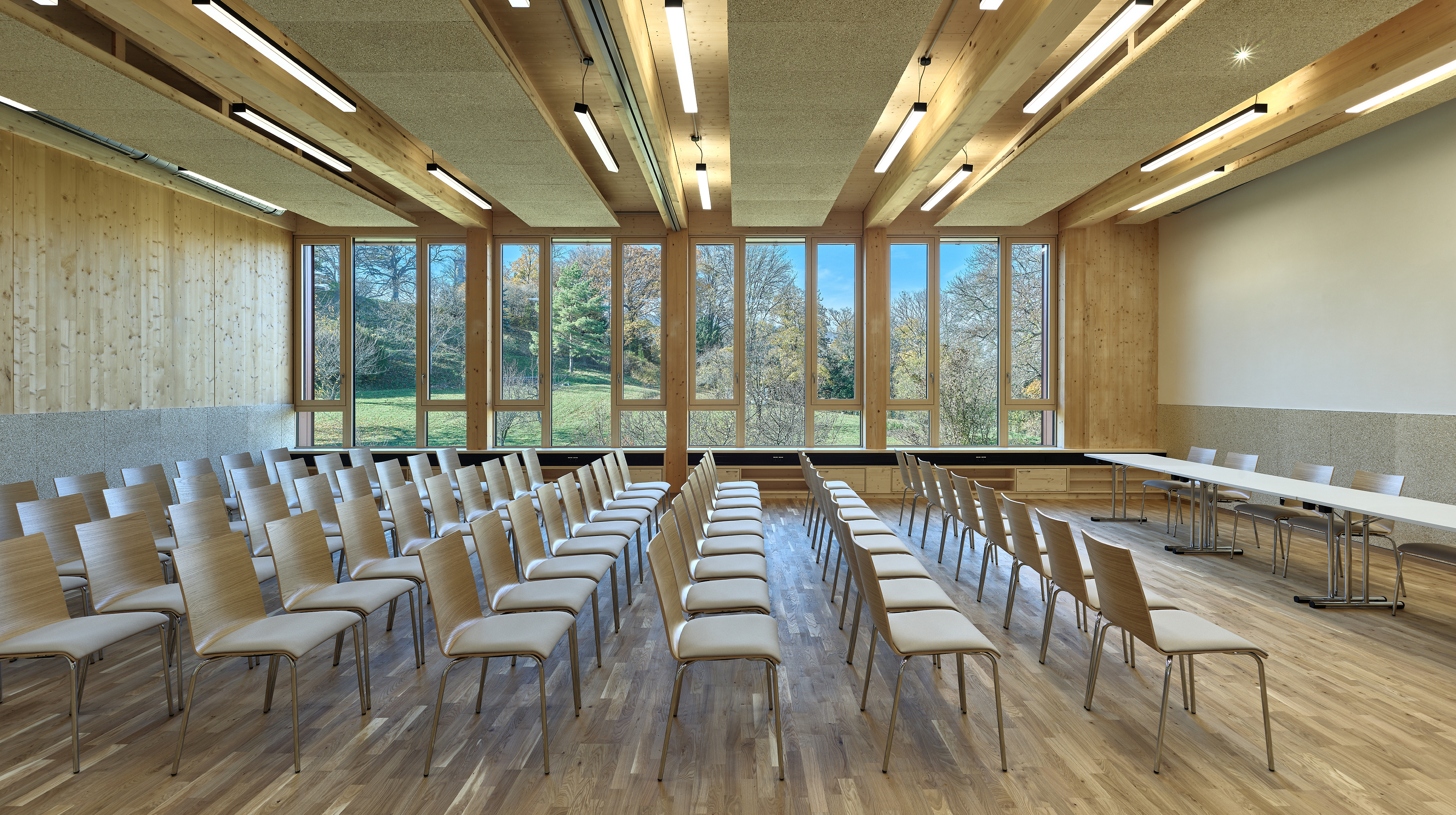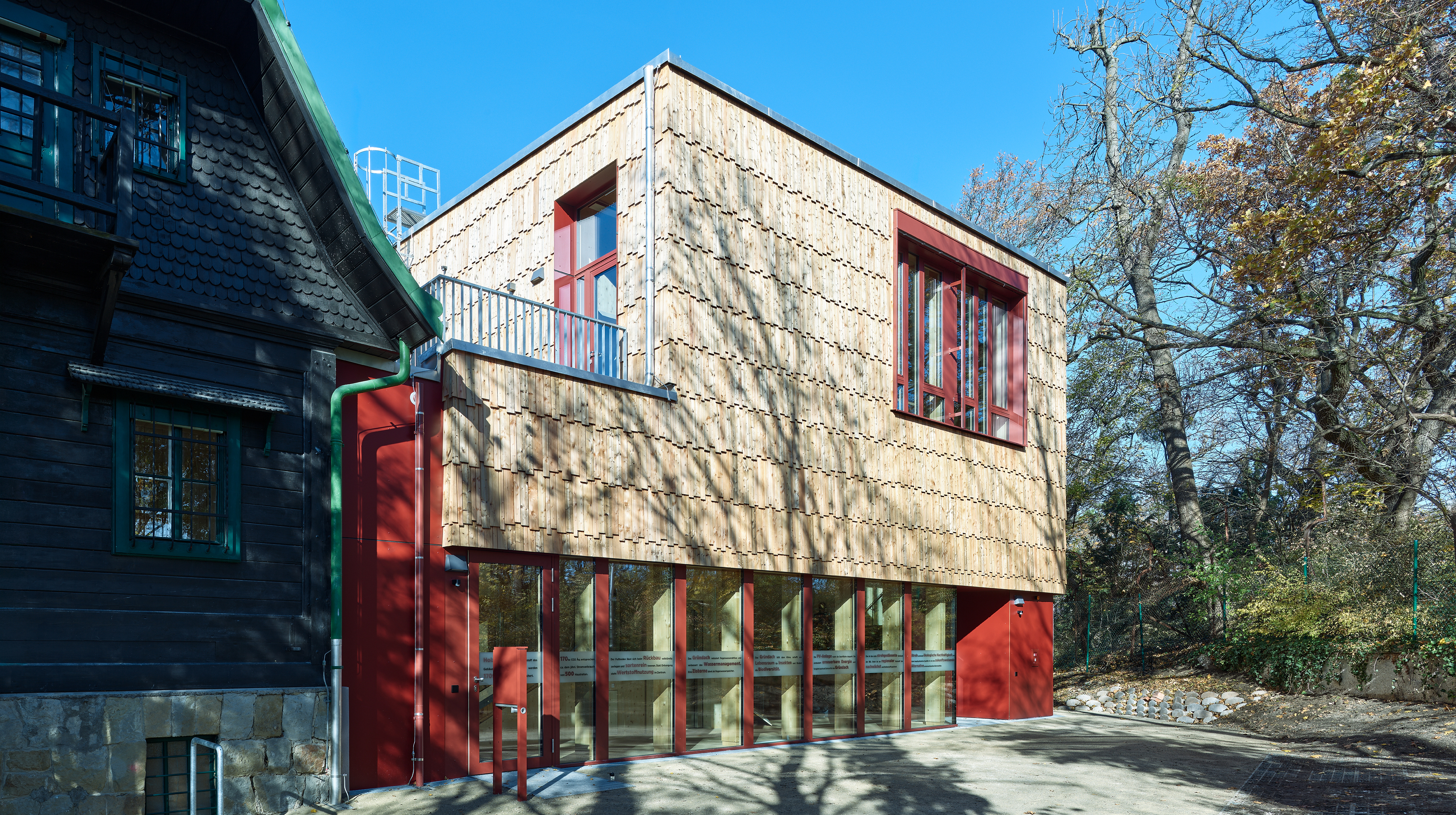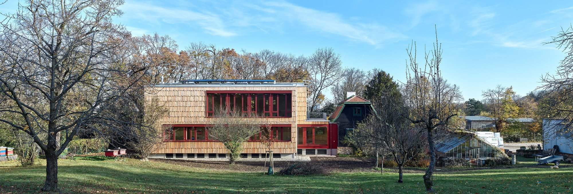 Im Auftrag des Bundesministeriums für Land- und Forstwirtschaft, Klima- und Umweltschutz, Regionen und Wasserwirtschaft verwirklichte die Bundesimmobiliengesellschaft ein Vorzeige- und Pilotprojekt für den nachhaltigen Bau öffentlicher Gebäude. Der zweigeschossige Neubau grenzt direkt an der Nord-Fassade des bestehenden 100-jährigen Holzhauses an. Ein offener Ankunftsbereich lädt Studierende und Büroangestellte über zwei getrennte Portale in den Eingangsbereich. Die zum Park ausgerichtete Bürofläche geht fließend in den Bestand über, lässt sich durch modulare Bauweise langfristig flexibel gestalten und bietet Platz für bis zu 14 Angestellte. Herzstück des Neubaus ist der von drei Seiten direkt und indirekt belichtete, teilbare Seminarraum mit einer Fläche von rund 120 m². Das Foyer des Seminarraums bietet lichtdurchflutete Wartemöglichkeiten und einen Ausgang auf einen in der gleichen Ebene angeordneten kleinen Außenbereich.